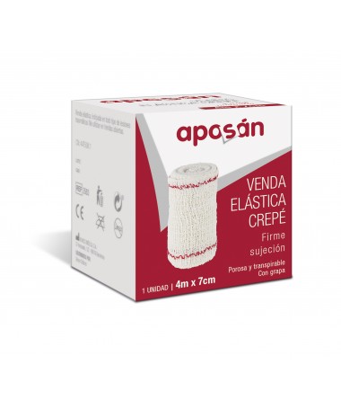 Aposan Venda Elastica Crepé 4m x 7cm. Indicada para todo tipo de lesiones traumáticas. Es una venda porosa y transpirable. Contiene grapa.