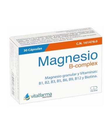 Magnesio+B complex 30cap. (VITALFARMA) Complemento alimenticio con Magnesio, Vitaminas B1, B2, B3, B5, B6, B9, B12 y Biotina que en una sola cápsula