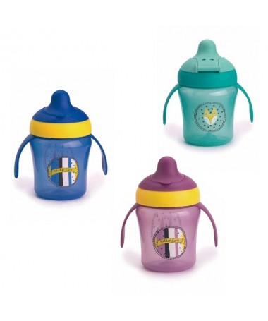 Vaso con asas y boquilla rígida antiderrame. Con tapa protectora abatible para mayor higiene.