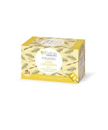 Farline Infusión Vías urinarias 20 sobres contiene cola de caballo, herniaria, grama, equinácea y sauco. Agradable sabor a naranja-canela