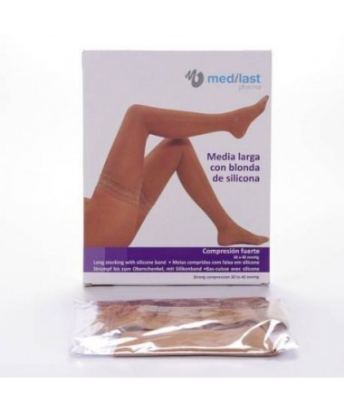 Medias Largas con sujeción de silicona de Compresión Fuerte (30-40 mmHg). Indicada en: varices o edemas severos, tras cirugía venosa, síndrome postrombótico,...