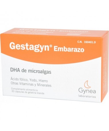 Complemento alimenticio con DHA de microalgas, vitaminas y minerales adaptados al periodo de embarazo.