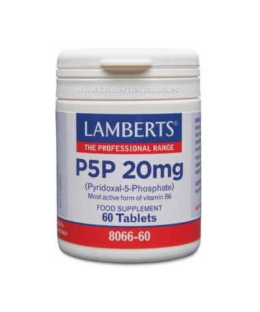 P5P 20mg. piridoxal-5-fosfato 60comp. (LAMBERTS) Vitamina B6 en forma activa. Esta vitamina desempeña un papel importante en diversas funciones del cuerpo, tales...