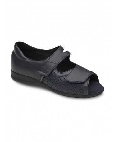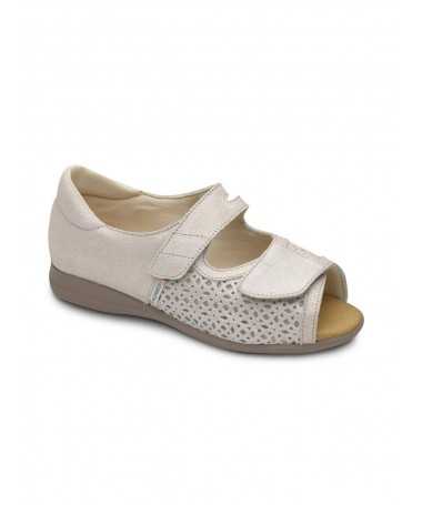 Zapatilla cerrada, que se abre totalmente para una mayor comodidad. Con cierre de velcro en empeine y talón.  Zapatilla apta para personas con problemas en los pies....
