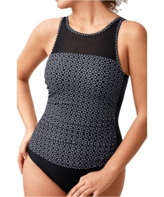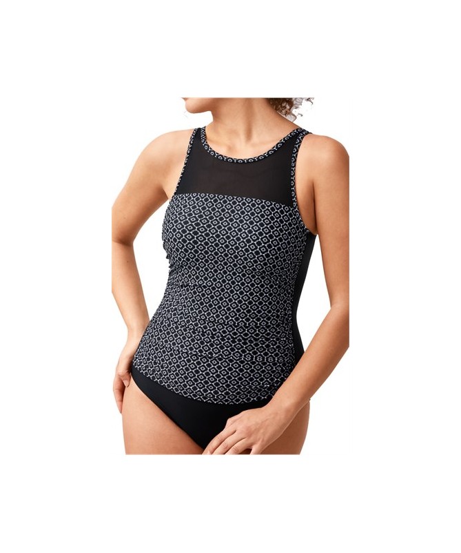 El traje de baño Amoena Ayon Sarong presenta un estampado geométrico en blanco y negro en la parte delantera y trasera. Una falda corta coqueta con fruncido en la barriga favorece la figura, y el inserto negro sólido agrega definición y enmarca el escote. El Ayon Sarong tiene fruncidos sutiles en la parte delantera que hacen que la cintura se vea increíble y un escote de altura media para mantener el pecho cubierto.