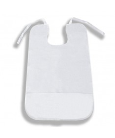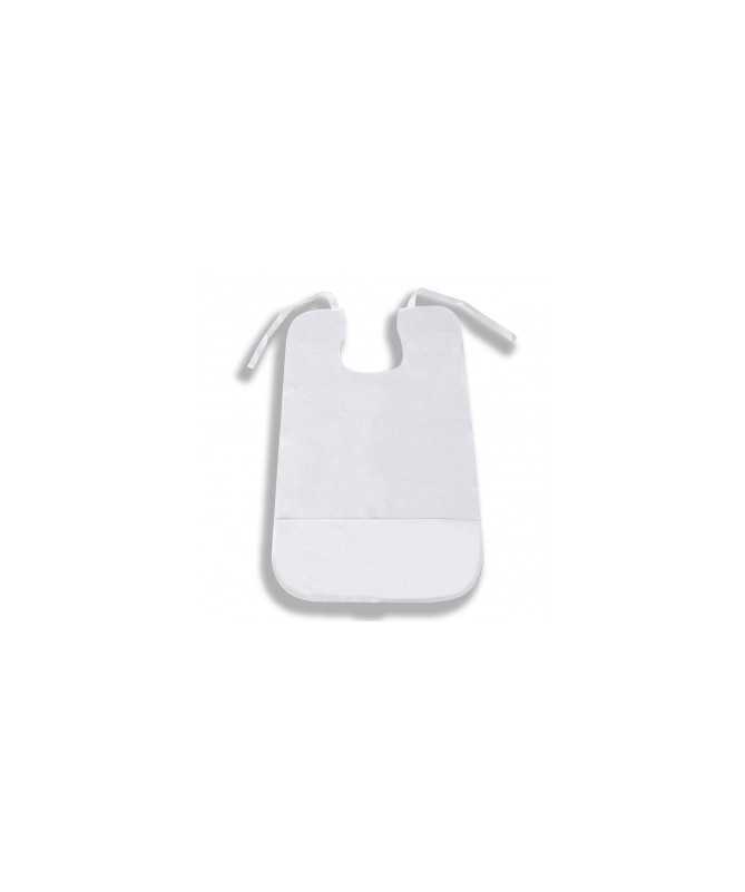 Babero de rizo impermeable, destinado a proteger su ropa de incómodas manchas. Está fabricado en talla única. Dispone de un bolsillo que recoge los restos de comida que suelen caerse mientras el usuario se alimenta.