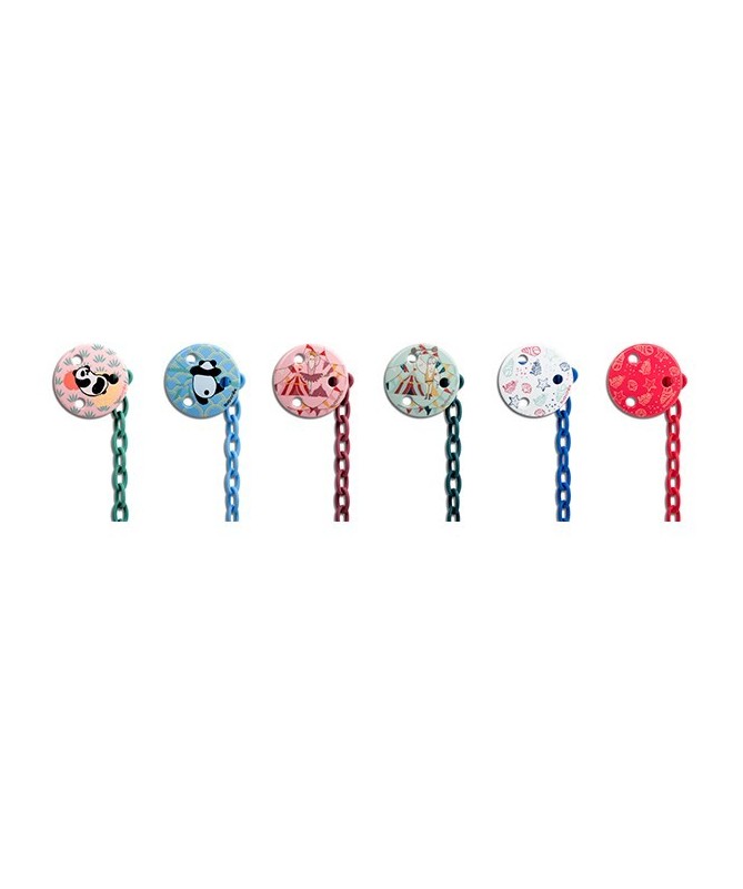 Consta de una pinza que se sujeta a la ropa y una cadena que en su terminación tiene una argolla para introducir el chupete.