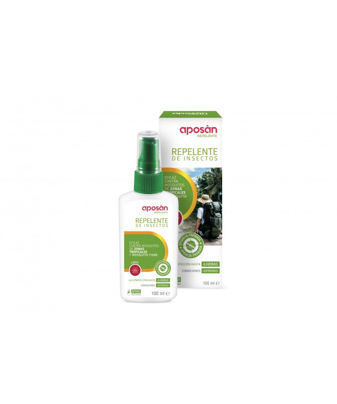 Aposán Repelente Forte Spray 100ml se trata de una solución eficaz y sencilla en formato de spray que evitará que se produzcan las molestas picaduras de mosquito incluso en las condiciones más extremas y climas tropicales. Consigue con tan solo unas pulverizaciones una gran protección de hasta 6 horas de prevención. Lo podemos utilizar tanto en adultos como en niños con más de 3 años. Evita la picadura del mosquito tigre.