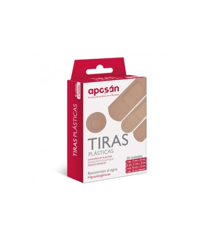 Aposan Tiras 30 Unidades 4 Tamaños se trata de una solución en tiritas de plástico que nos permitirán proteger la herida con el apósito necesario para nuestra herida, ya que contiene hasta 4 tamaños. El acabado es bastante cómodo para que podamos olvidarnos por completo de la herida. En su capa central posee una gasa, preparada para absorber los exudados de las heridas, para que estén limpias y que no se infecten.