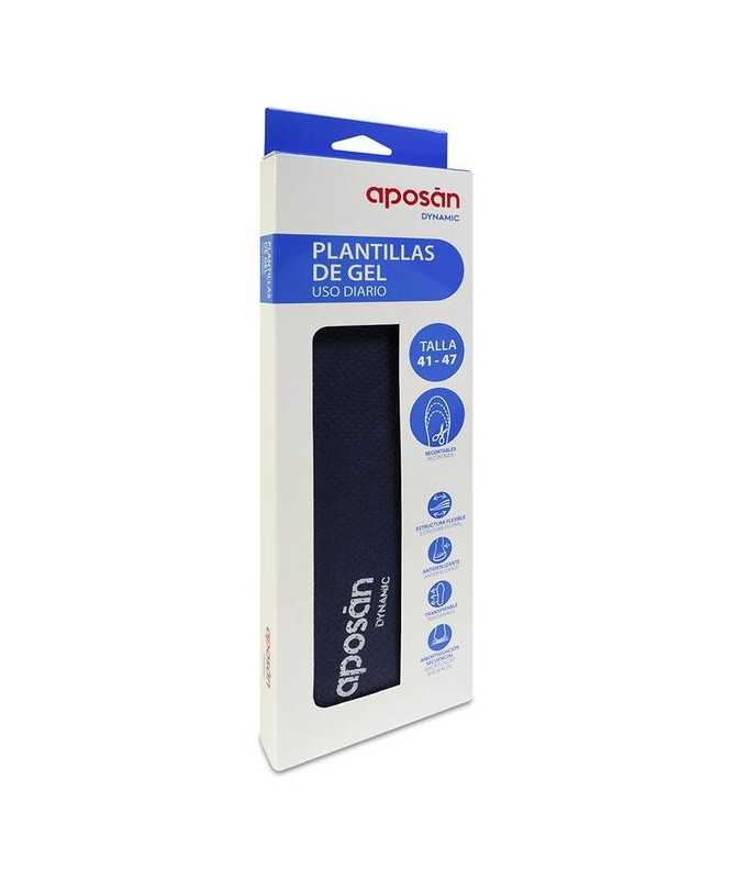 Aposán Plantillas Gel Dynamic son plantillas de gel que ayudan a prevenir y reducir las molestias que pueden producirse al correr o andar. Tratamiento sintomático del espolón calcáneo, bursitis plantar, talalgias, metatarsalgias, pies dolorosos y pies cansados. Son plantillas recortables, con una estructura flexible y antideslizante para aumentar la comodidad al caminar. Además, son transpirables. Cumple la normativa de productos sanitarios. Consultar las instrucciones antes de utilizarlos.