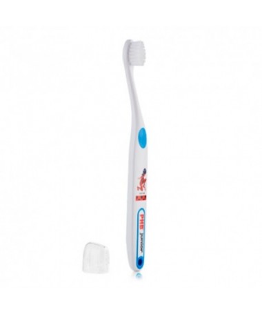 Cepillo de dientes de filamentos duros. Tiene el cabezal redondeado, es de pequeño tamaño, lo que facilita el cepillado y el acceso a las zonas más alejadas.