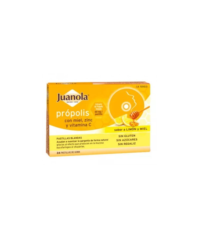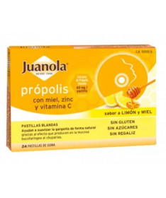 Juanola Própolis Sabor Miel y Limón 24 pastillas son unos caramelos con sabor a miel y limón para suavizar la garganta cuando está seca o irritada. El própolis y la miel aportan flavonoides, aceites esenciales y diferentes vitaminas que mejoran la barrera defensiva de esta zona del cuerpo, mientras el limón contribuye en la mejora de las molestias relacionadas con la garganta.