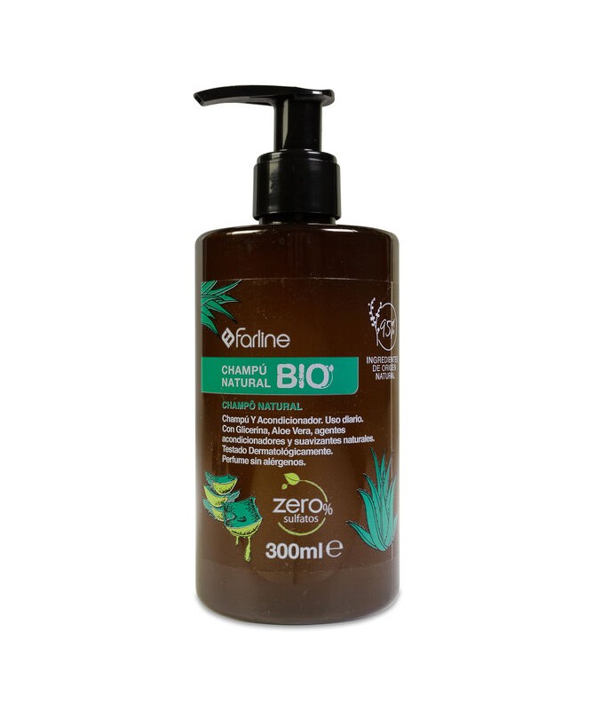 Farline Champú Natural BIO es un producto 2 en 1, champú y acondicionador, apto para su uso diario con un 95% de ingredientes de origen natural. Contiene Glicerina, Aloe Vera, agentes acondicionadores y suavizantes naturales. Ha sido testado dermatológicamente y su fórmula no contiene sulfatos.
