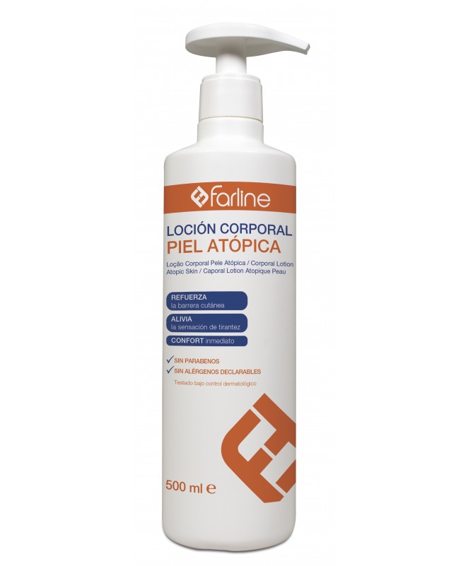 Farline Piel Atópica Loción 500ml cuida de tu piel. La piel con tendencia atópica suele sufrir más que cualquier otro tipo de piel. Las personas con atopia se ven afectadas por factores externos de una forma mucho más intensa que los demás, además de sufrir brotes aparentemente espontáneos. La atopia aparece, incluso, por motivos internos como el estrés o los nervios. Para este tipo de pieles, Farline ha desarrollado esta loción corporal. Gracias a su fórmula, que no contiene parabenos ni alérgenos, refuerza la barrera de la piel, de forma que se producen menos brotes, al mismo tiempo que alivia la sensación de tirantez hidratando en profundidad la piel y dejándola elástica y suave. El efecto es inmediato y la textura muy agradable.