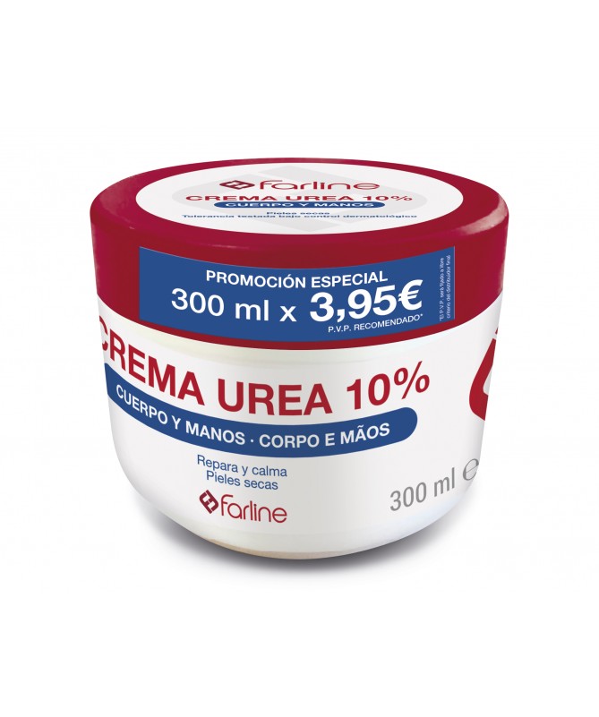 Farline Crema Urea 300ml es un tratamiento formulado con un 10% de urea para proporcionar un tacto suave a las pieles secas y muy secas. Esta crema corporal nutre la piel intensamente y ayuda a reducir la descamación. Farline Crema Urea, que se presenta en formato de 300ml, proporciona una tolerancia testada bajo control dermatológico.