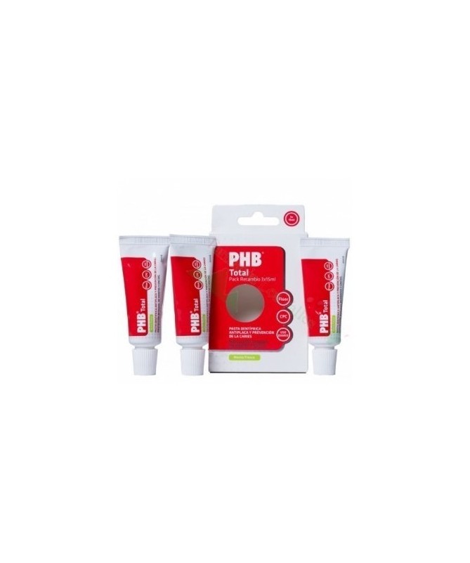 Pasta dental flúor PHB antiplaca en formato viaje 3 unidades x 15 ml.