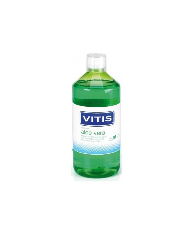 El colutorio de Aloe Vera de Vitis limpia de forma eficaz tus dientes, a la vez que los protege de caries y cuida tu boca y encías.