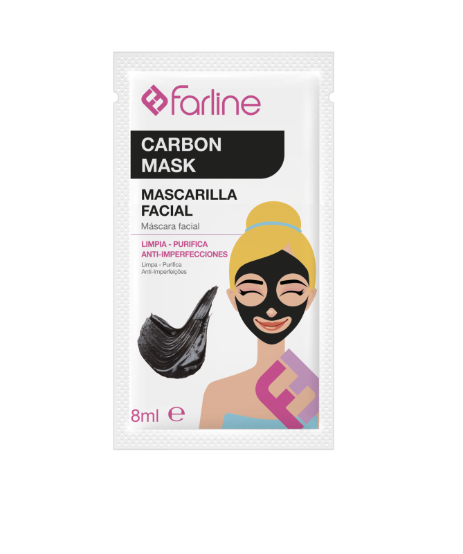 Mascarilla Facial Carbón Farline 8ml Esta mascarilla con carbón limpia, purifica y corrige pequeñas imperfecciones de la piel. Ayuda a eliminar impurezas, toxinas y exceso de sebo. Limpia los poros y reduce los brillos.
