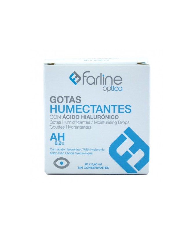 Farline Gotas Humectantes Ácido Hialurónico 0,2% 20x0,40ml se trata de una solución en gotas con las que podremos aliviar los síntomas de la sequedad ocular y proteger adecuadamente los ojos de la contaminación ambiental. Esto lo logra gracias a su composición en la que encontramos: ácido hialurónico de alto peso molecular, que forma una capa protectora en la superficie del ojo. Este compuesto también se centra en captar agua. Podemos utilizarlas independientemente de las lentes de contacto que utilicemos.