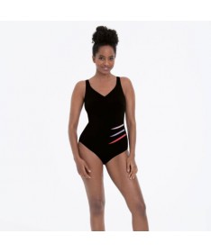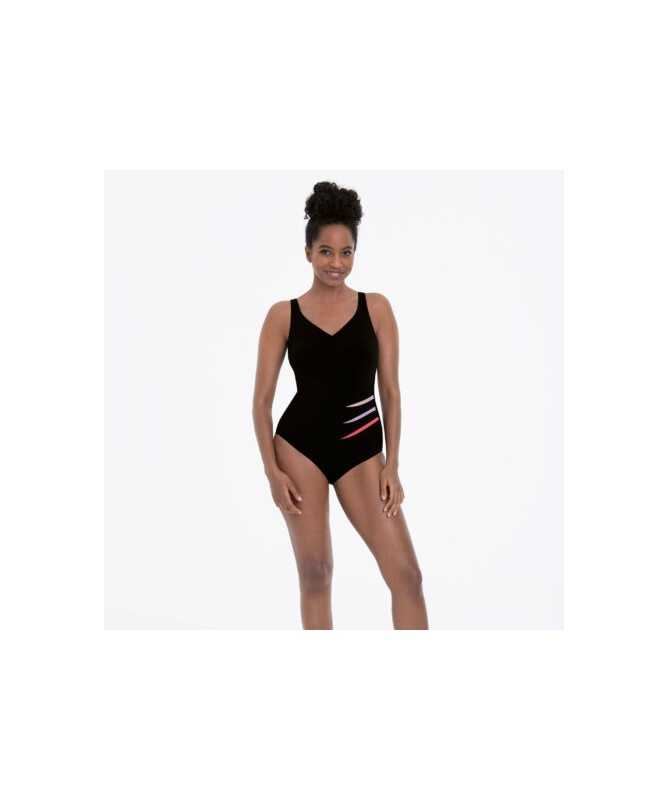 Genua 6203 bañador para prótesis de la marca Anita. Bañador de la línea ANITA CARE, tipo deportivo resistente al cloro y de secado rápido. Bañador tipo camiseta muy adaptable y cómodo. El escote en pico y el color negro con las aplicaciones a nivel de la cintura, ayudan a estilizar la figura ópticamente.79.99