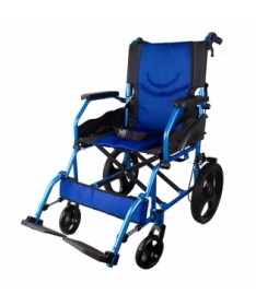 Esta silla de ruedas de aluminio dispone de un respaldo fijo de color azul y negro, reposabrazos fijos rectos largos y reposapiés abatibles hacia arriba, además de un respaldo abatible, que le harán más fácil la vida al usuario y sus familiares.