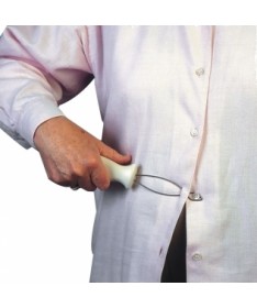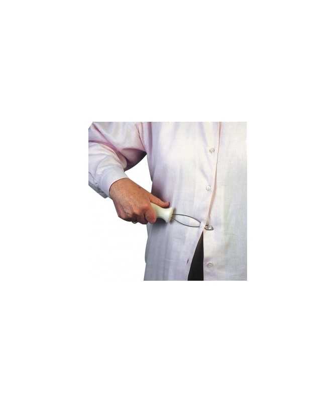 Se compone de un alambre de acero inoxidable y un mango anatómico preparado para una mayor ergonomía del usuario. Para usarlo, pasa el alambre por el ojal de tu prenda y toma el botón desplazándolo por dentro del ojal.