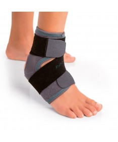 Dispone de un diseño abierto en la parte anterior. También incluye una banda elástica estabilizadora para controlar los movimientos de lateralidad del tobillo. La tobillera se cierra mediante un sistema sencillo de velcros que permite adaptarla según las características físicas del niño. Es de color gris y azul. Este modelo es de talla 2, fabricada para niños de 6 a 12 años o hasta 24 cm de contorno de tobillo. Posee un tejido acolchado, suave y transpirable. Cumple la normativa de productos sanitarios. Consultar las instrucciones antes de utilizarlos.