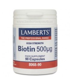 Biotina 500 mcg. 90 cap. (LAMBERTS)  La biotina contribuye al proceso que libera energía de los alimentos y al mantenimiento normal de la piel, el cabello y las mucosas. También apoya a la función normal psicológica, al sistema nervioso y el metabolismo de los macronutrientes. Apto para veganos y vegetarianos.
