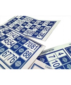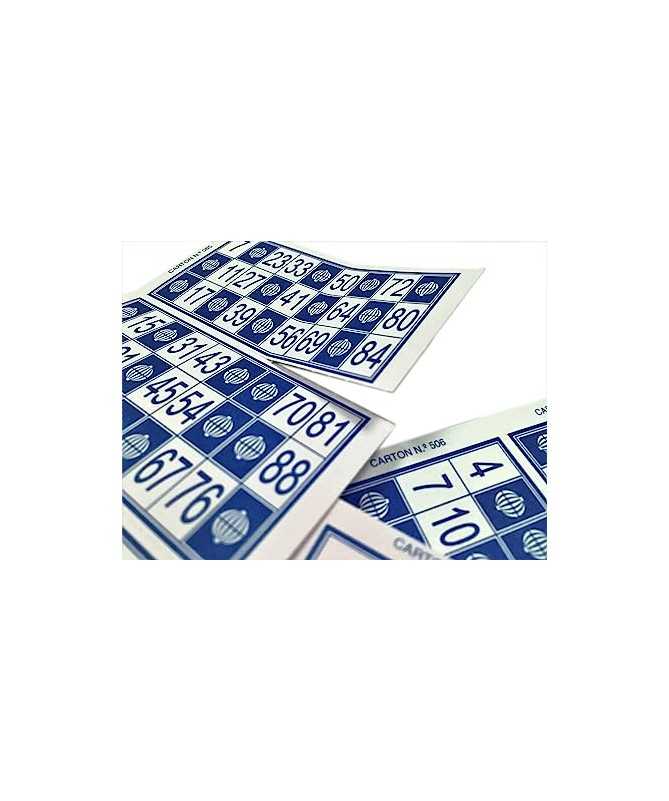 Cartones para tachar o usar fichas. Están troquelados entre sí para facilitar la separación individual entre ellos. El paquete contiene una serie completa de 600 cartones completamente diferentes entre sí. Están numeradas individualmente por lo que en caso de compra más series, es posible garantizar que no haya Cartones con la misma numeración en el mismo lote. Están hechos para bingo tradicional de 90 bolas. Realizado con cartulina de alta calidad de 190 gr.. Las dimensiones de un cartón son 115 x 52 mm. Fabricado en color Azul.
