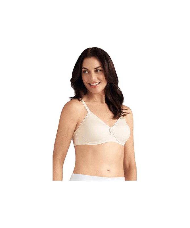 El sujetador sin aros de copa suave Amoena Lara tiene copas moldeadas ligeramente acolchadas para una apariencia suave y una silueta sin costuras y un bordado de hojas decorativas en el centro del frente. Tiene copas de espuma cubiertas con micro tejido elástico que abraza el cuerpo y equilibra los desniveles.