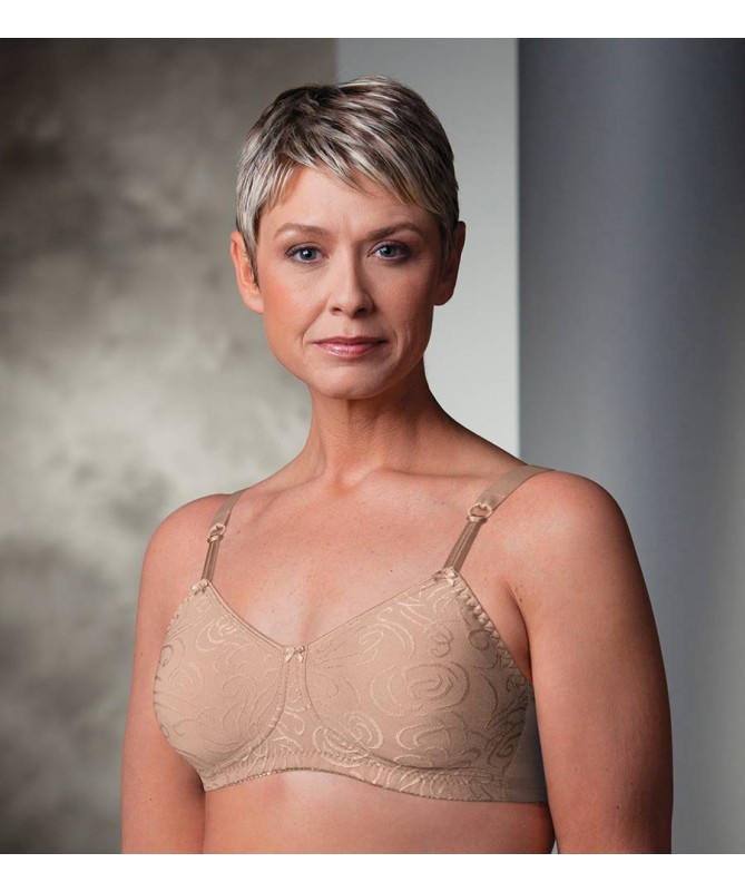 Sujetador Mastectomía marca de Prim Sujetador sin aros con costuras especiales para sentirse cómoda. Tirantes finos, tiras dobles en su parte frontal. Modernos y estrechos para que no se claven en los hombros. Tejido liso con flores brocadas muy elegante. Los broches posteriores tienen 2 alturas y 3 niveles de ajuste
