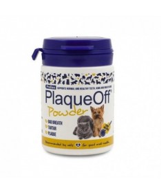 PlaqueOff Polvos antisarro es un producto natural a base de algas marinas para la higiene dental de tu mascota. Este artículo para perros y gatos ayuda a eliminar la placa bacteriana, el sarro y el mal aliento en el animal. Su exclusiva receta, patentada y clínicamente probada, asegura el cuidado de la higiene bucal de tu mejor amigo.