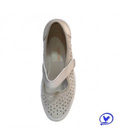 Doctor Cutillas Modelo 38454 – Zapato mercedes para mujer en materiales flexibles. Tiene plantilla extraíble acolchada en tejido. Con tira en el empeine para su ajuste. El material tiene perforaciones y piedras de adorno. Puntera, talón y tira del empeine en material nacarado al tono. Piso de goma micro ligero con cuña de 2 cm.