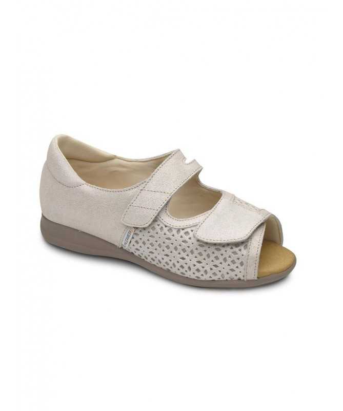 Sandalia con cierre regulable mediante dos velcros y la talonera cerrada con contrafuerte estabilizador; este tipo de cierre permite una gran apertura. Pala troquelada permitiendo mayor transpirabilidad y confección en piel, tanto exterior como interior, sin costura interiores.
